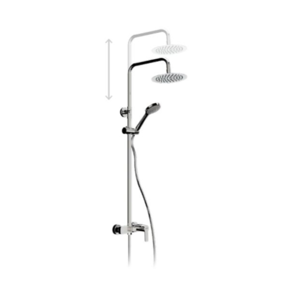 Mezclador monomando con salida superior y cartucho cerámico de 35 mm apertura en frío. Altura regulable e inversor integrado con soporte deslizante ajustable. Rociador anticalcáreo inox. de 250 mm y flexible metálico de 1,50 m con doble grapaje. Mango de ducha anticalcáreo con 3 funciones.