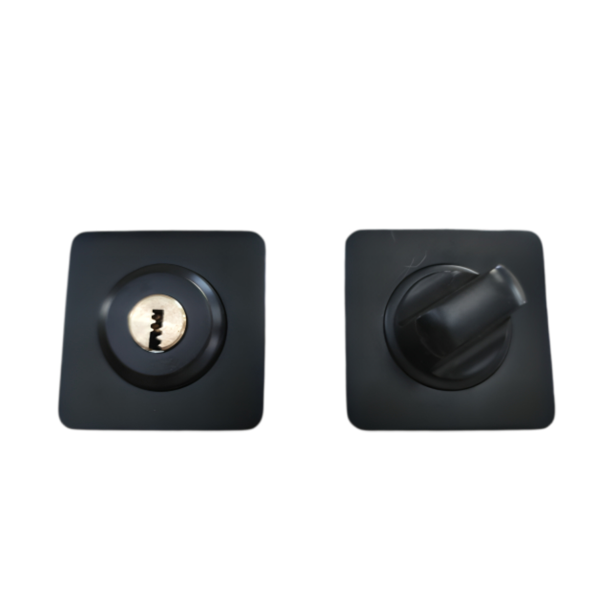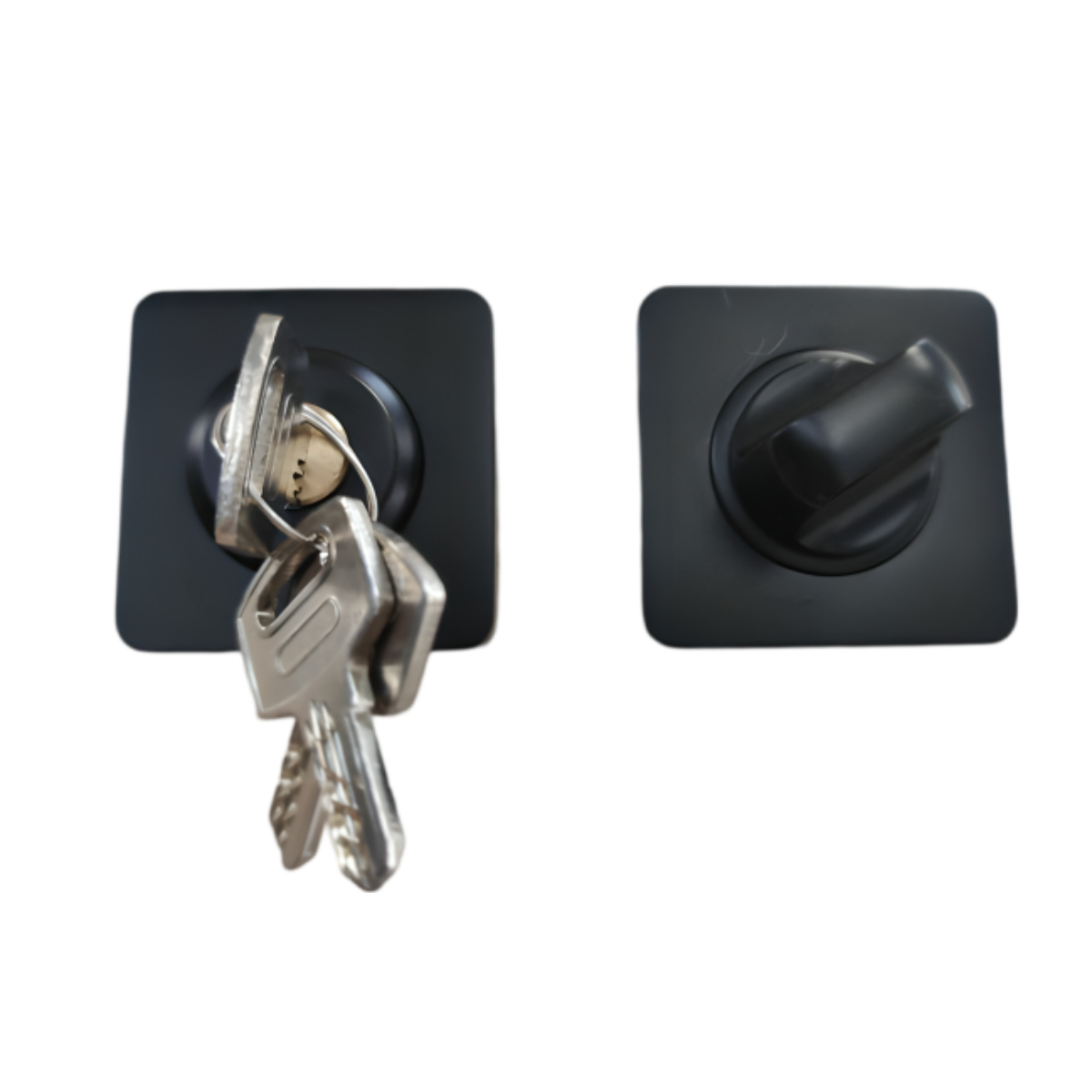 Pestillo puerta interior para baños y habitaciones. Con apertura desde el exterior mediante una llave si fuera necesario acceder una vez condenada la puerta desde el interior y para cerrar desde el exterior. En color negro mate.