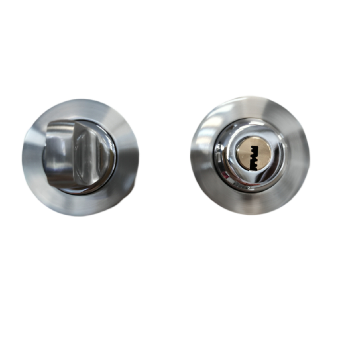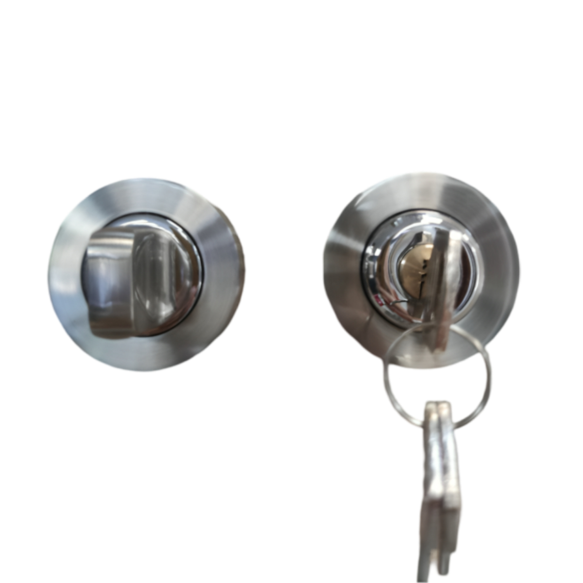Pestillo puerta interior para baños y habitaciones. Con apertura desde el exterior mediante una llave si fuera necesario acceder una vez condenada la puerta desde el interior y para cerrar desde el exterior. En color niquel satinado.