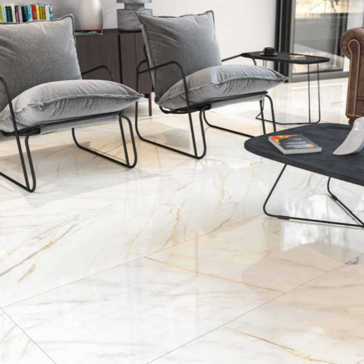Azulejo porcelánico rectificado de forma rectangular e imitación a mármol. Descubre el encanto atemporal del pavimento cerámico. Estos azulejos con acabado brillo aportan un toque de elegancia a tu espacio.