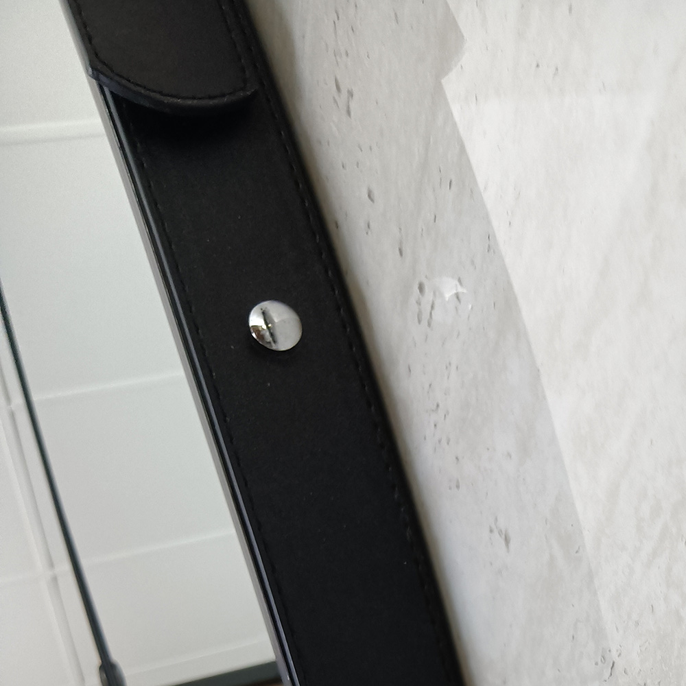 El espejo para colgar de metal negro con cinta encajaría perfectamente en la decoración de tu hogar.