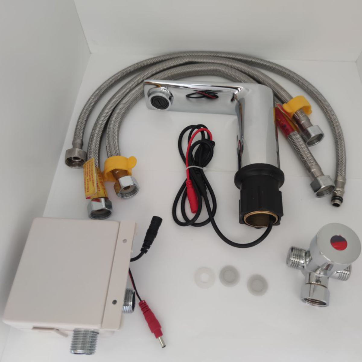 La caja contiene 1 grifo de caño bajo y 3 latiguillos. (pilas AA 1.5v DC no incluidas)