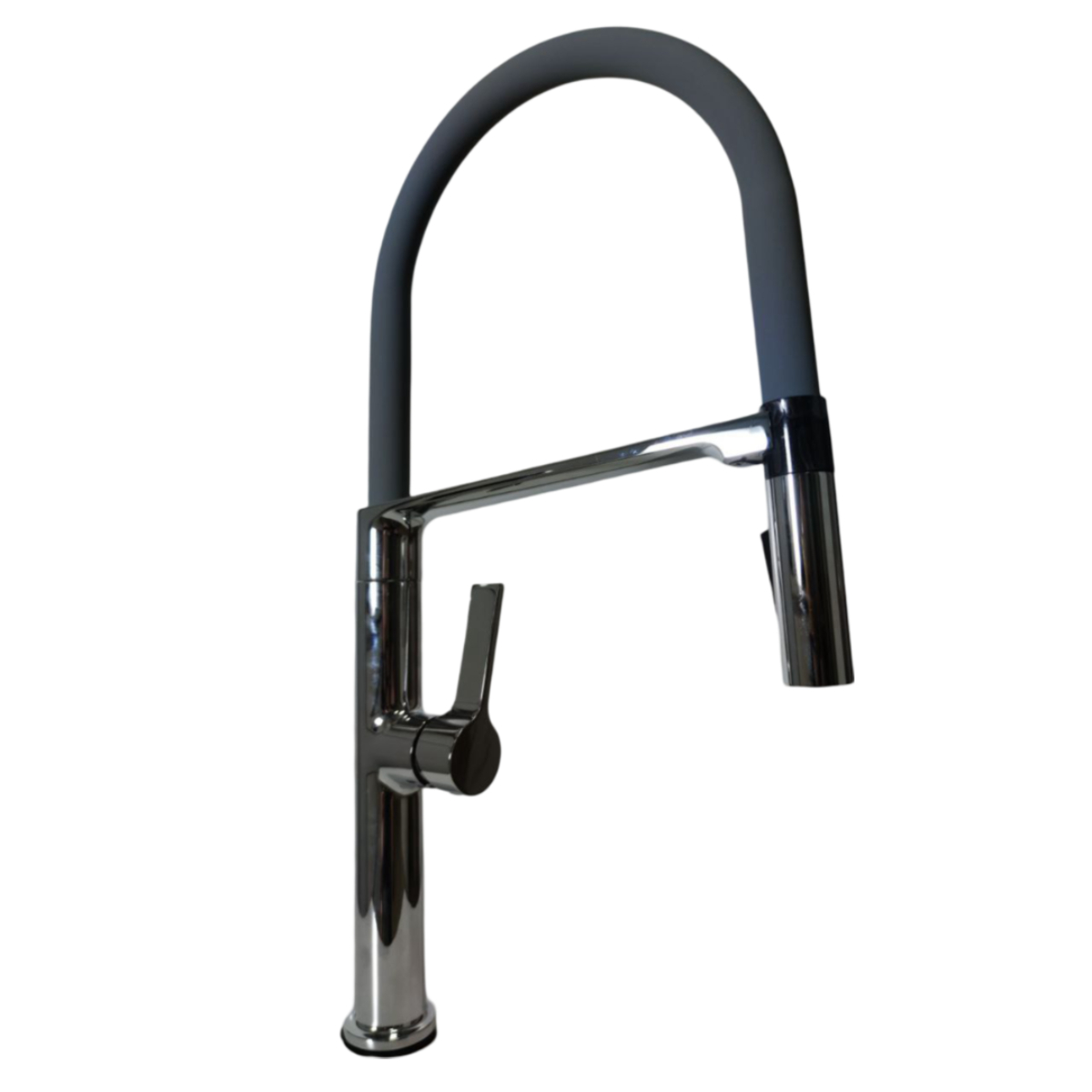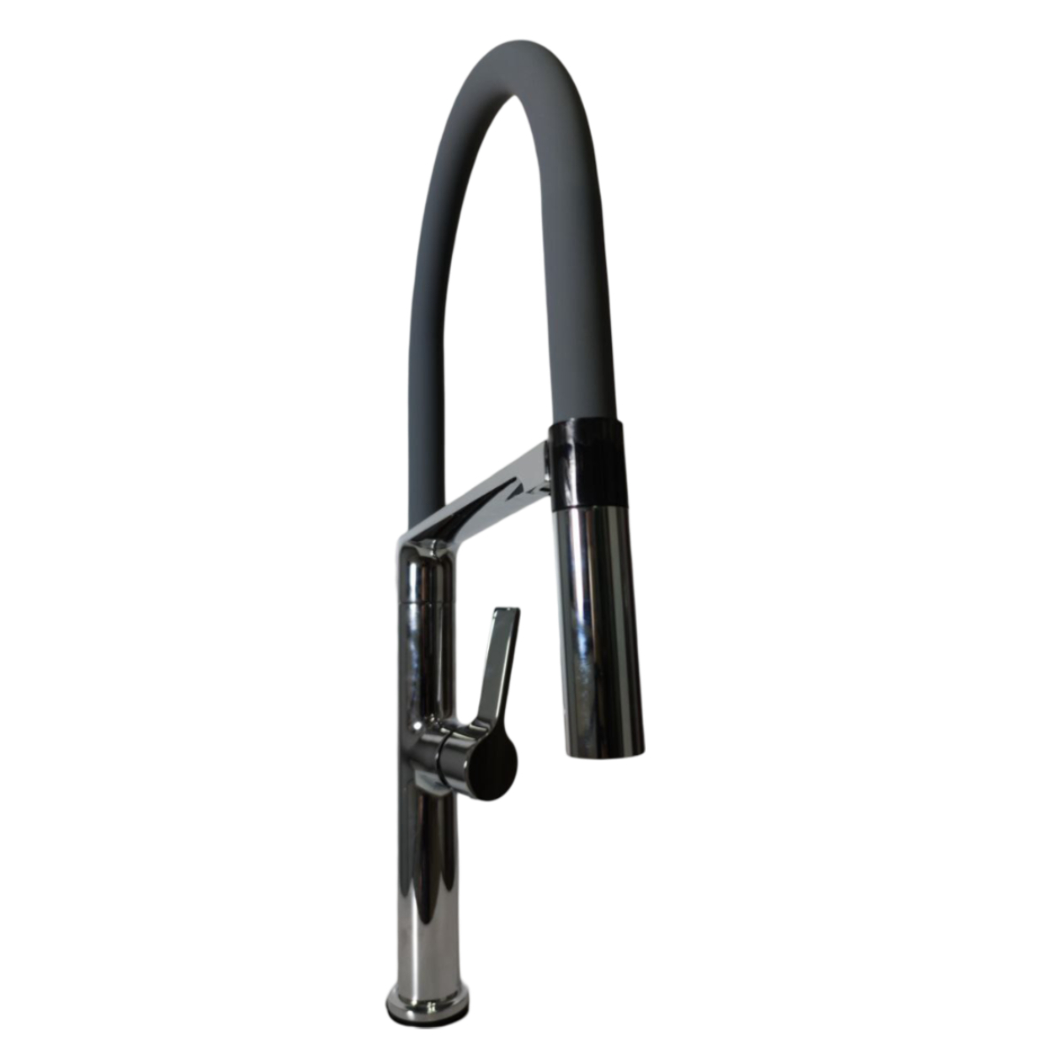 Grifo de cocina flexible con monomando, con cuerpo de latón y combinado con caño flexible de gel. Se adapta a cualquier tipo de movimiento. Salida de agua multifuncional. Sujeción del caño flexible imantada.