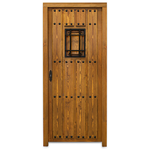 Puerta de entrada Modelo Granada de pino tintado al agua color nogal, con 4 bisagras antipalanca y cerradura de seguridad de 1 punto y bombín de seguridad. Con los herrajes negros esta puerta de entrada dará un toque rústico a tu vivienda gracias a sus tachuelas negras, manilla interior y embellecedor de bombín negro. Incluye la reja de color negro en el ventanillo.