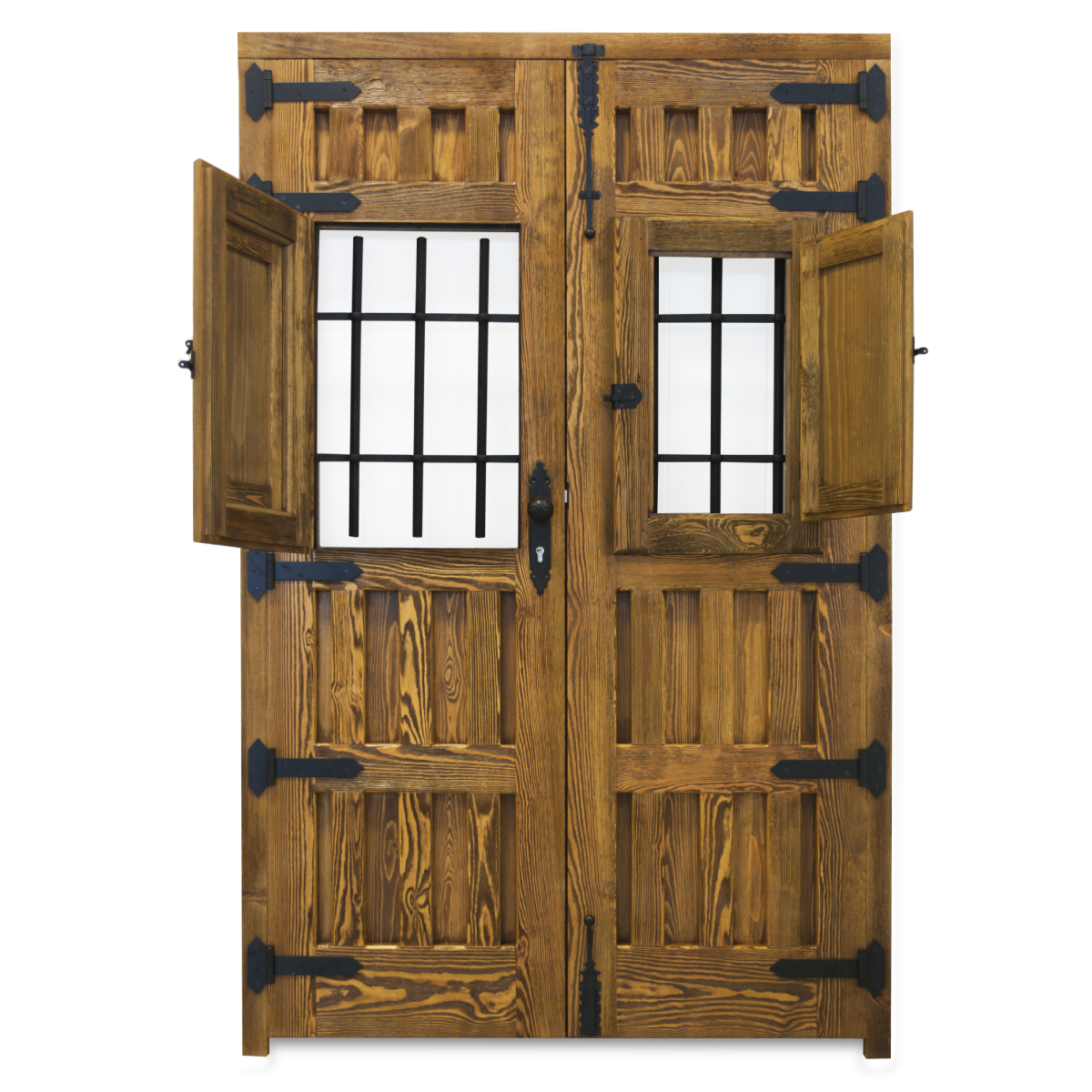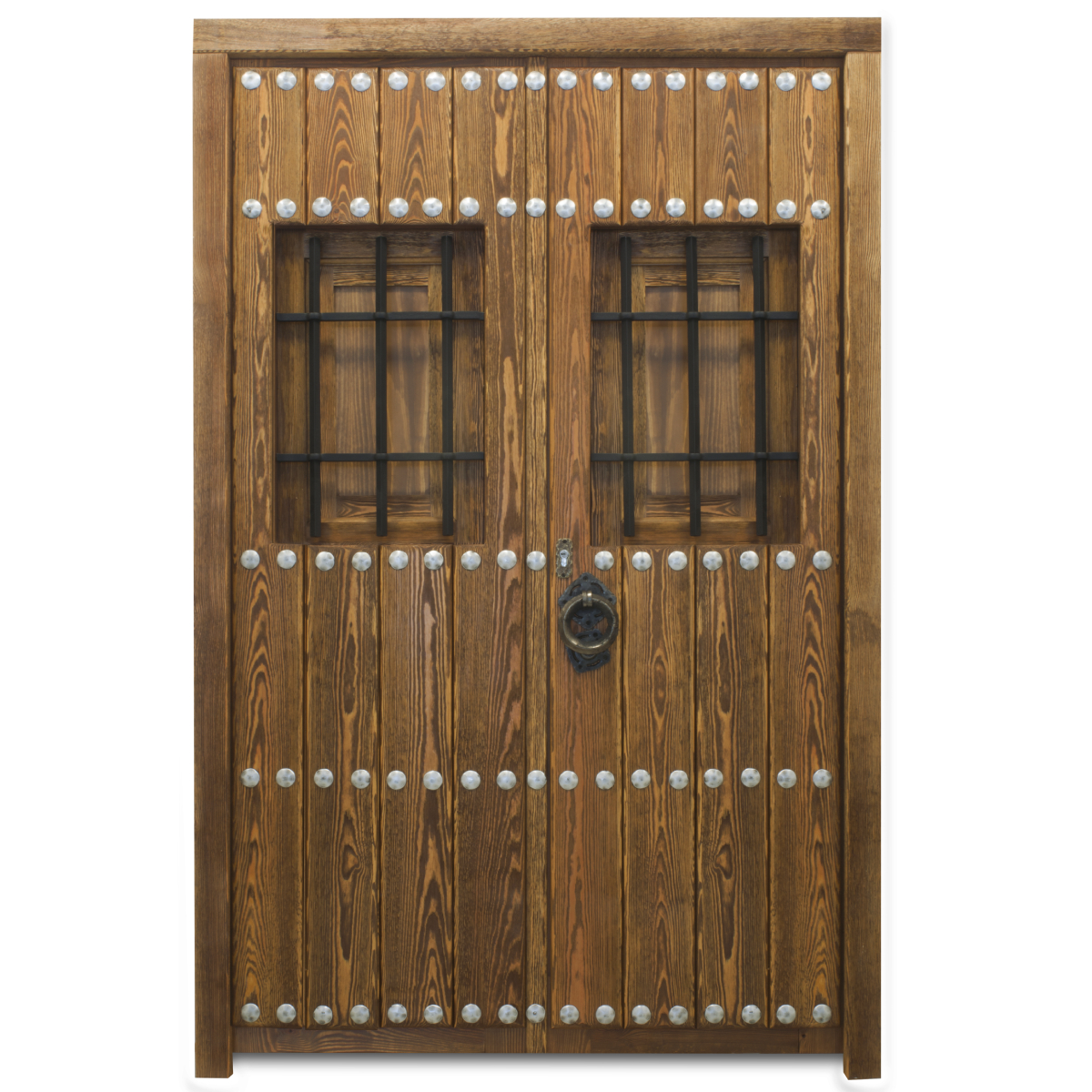 Pino veteado tintado al agua color Nogal envejecido, herraje negro bisagra sobrepuesta y cerradura de seguridad de 1 punto con bombín de seguridad, tachuelas y llamador en forja oxidable, manilla interior y