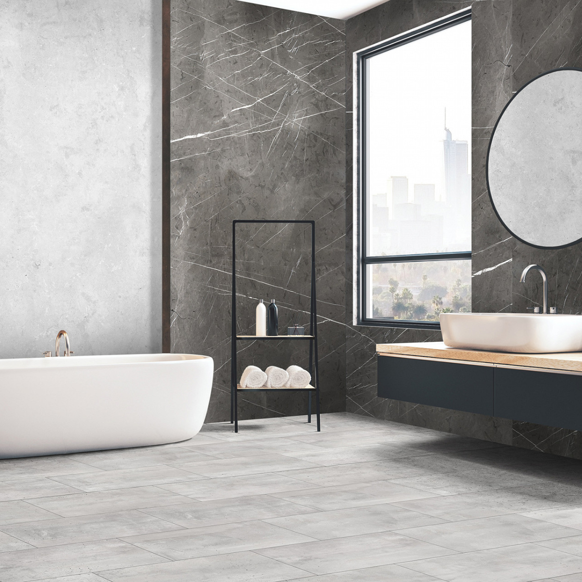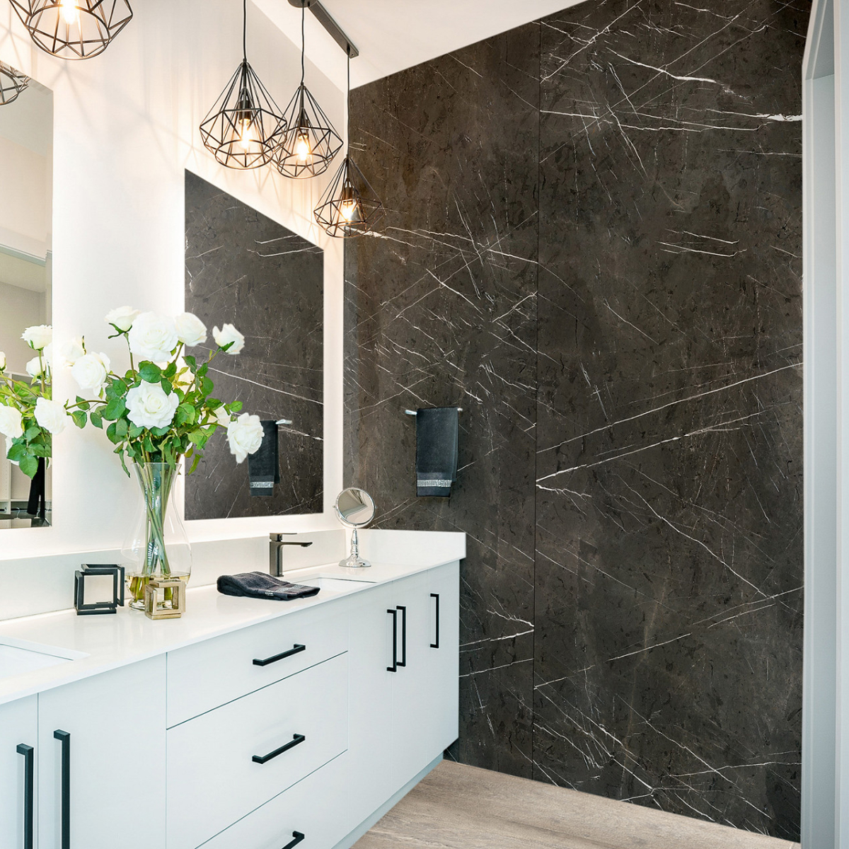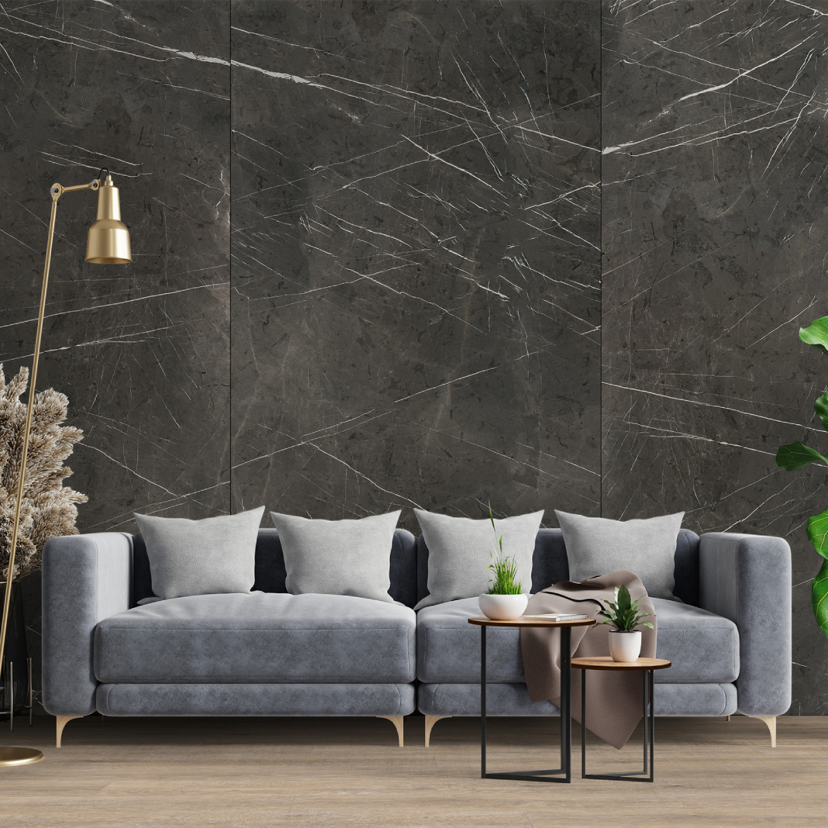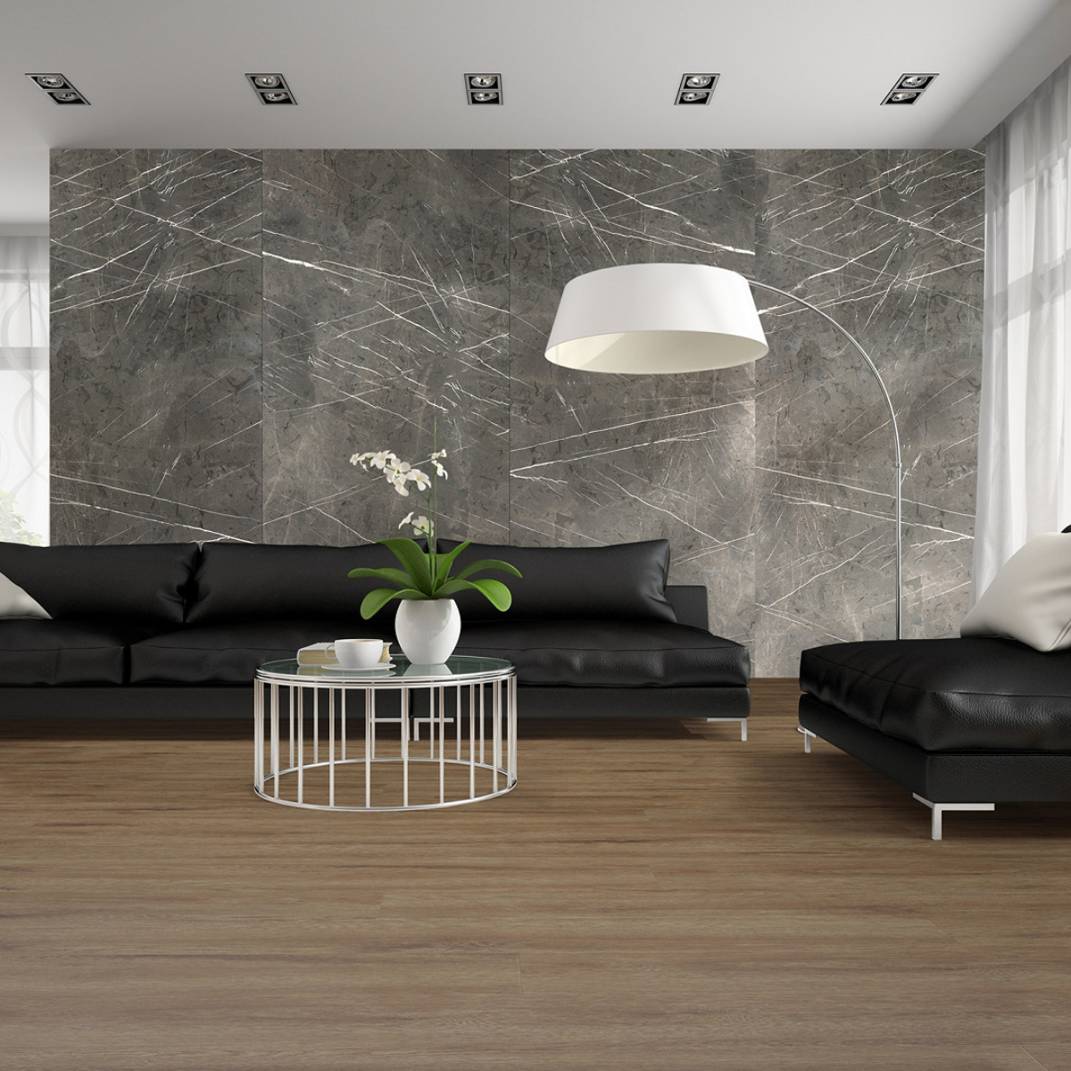Revestimiento de pared impermeable de la marca Kronospan. La marca Rocko es una gama de paneles de pared SPC impermeables de gran formato que impresionan con su hermoso diseño y excepcionales parámetros de rendimiento. Producidos con tecnología de impresión digital, los paneles de pared con diseños modernos que imitan a la perfección la madera, el hormigón o el mármol se pueden utilizar desde la sala de estar hasta la cocina y el baño. Los productos Rocko se caracterizan por una estabilidad dimensional excepcional , lo que les permite ser instalados en habitaciones muy insoladas y de uso intensivo. A su vez, la resistencia al agua y la alta resistencia a daños y rayones los hacen ideales para la cocina o el baño. Las losas Rocko son un gran producto para una renovación rápida del baño. Además, el patrón de mármol no sucumbirá a las tendencias cambiantes. Los paneles de pared Rocko también se pueden utilizar en el espacio encima de la encimera de la cocina. Los paneles de pared impermeables de gran formato Rocko son una auténtica revolución entre los materiales de acabado y decoración. Los tableros livianos y delgados reemplazarán la pintura, el papel tapiz, el gres y las baldosas cerámicas en la pared. Rocko Tiles son fáciles de instalar, impermeables, higiénicos, funcionales y dimensionalmente estables. Son un material ideal para reformar estancias antiguas , ya que se pueden instalar sobre baldosas antiguas u hormigón. Las delicadas vetas blancas de este diseño contrastan sobre un fondo gris oscuro, lo que confiere al Mármol Pietra Gris un aspecto auténtico realmente impresionante. Puede combinarse con éxito con unicolores, maderas claras naturales e incluso hormigones para crear soluciones de interior excepcionales.