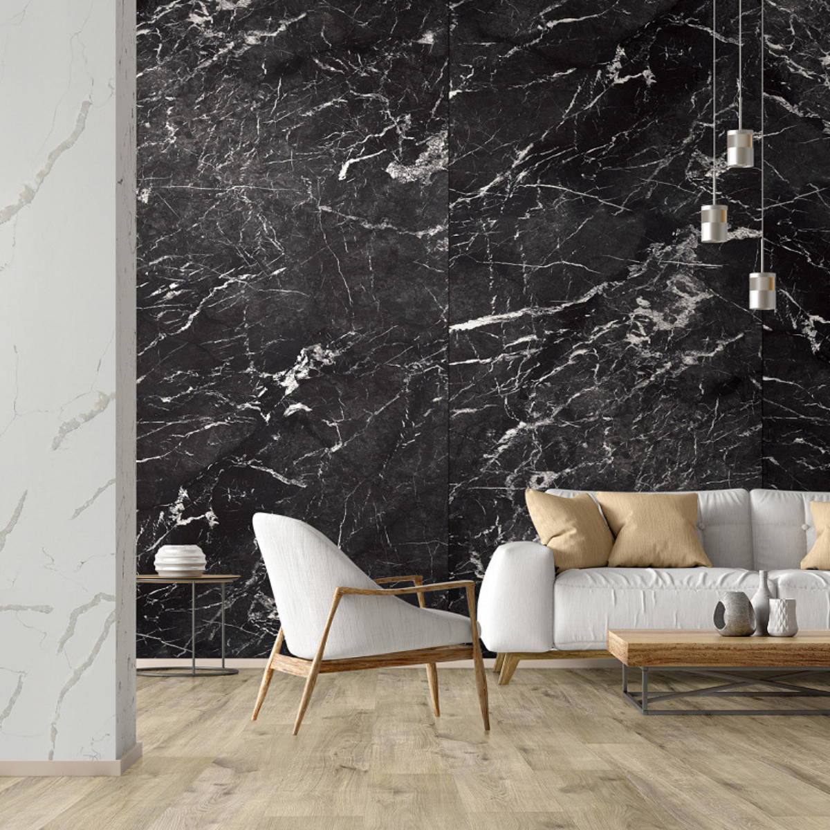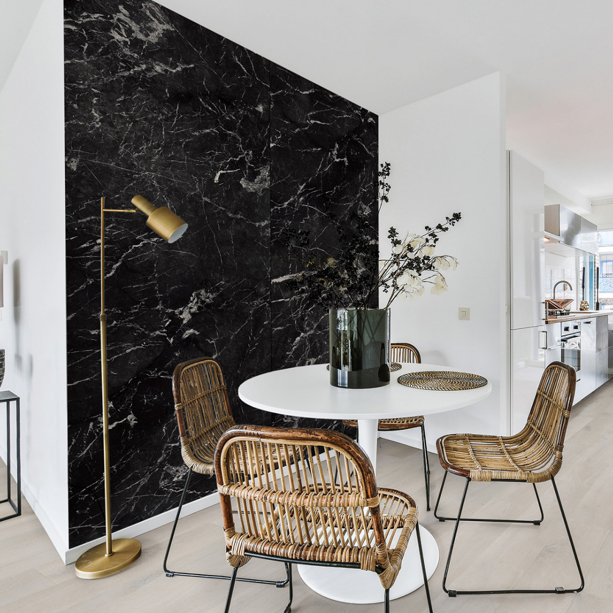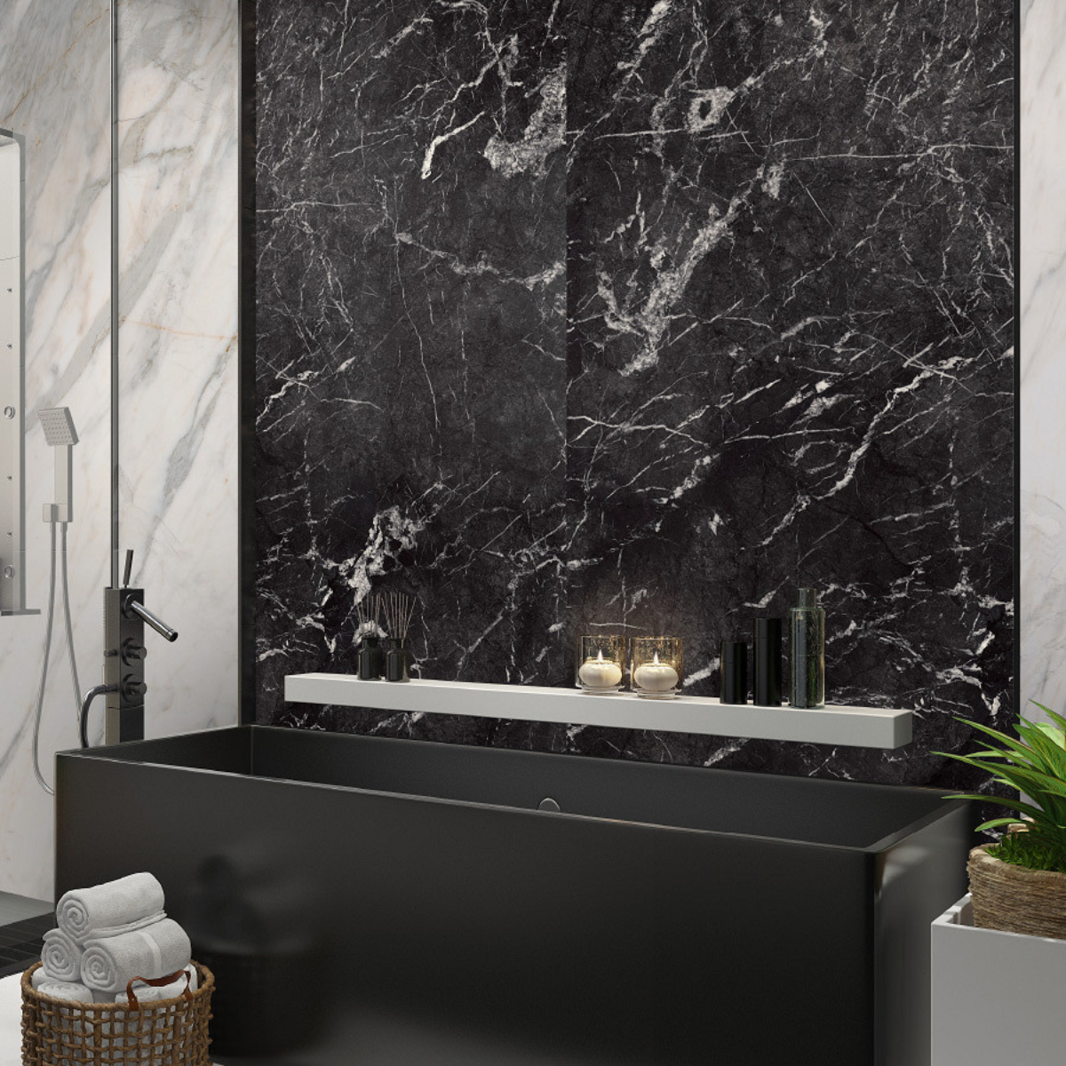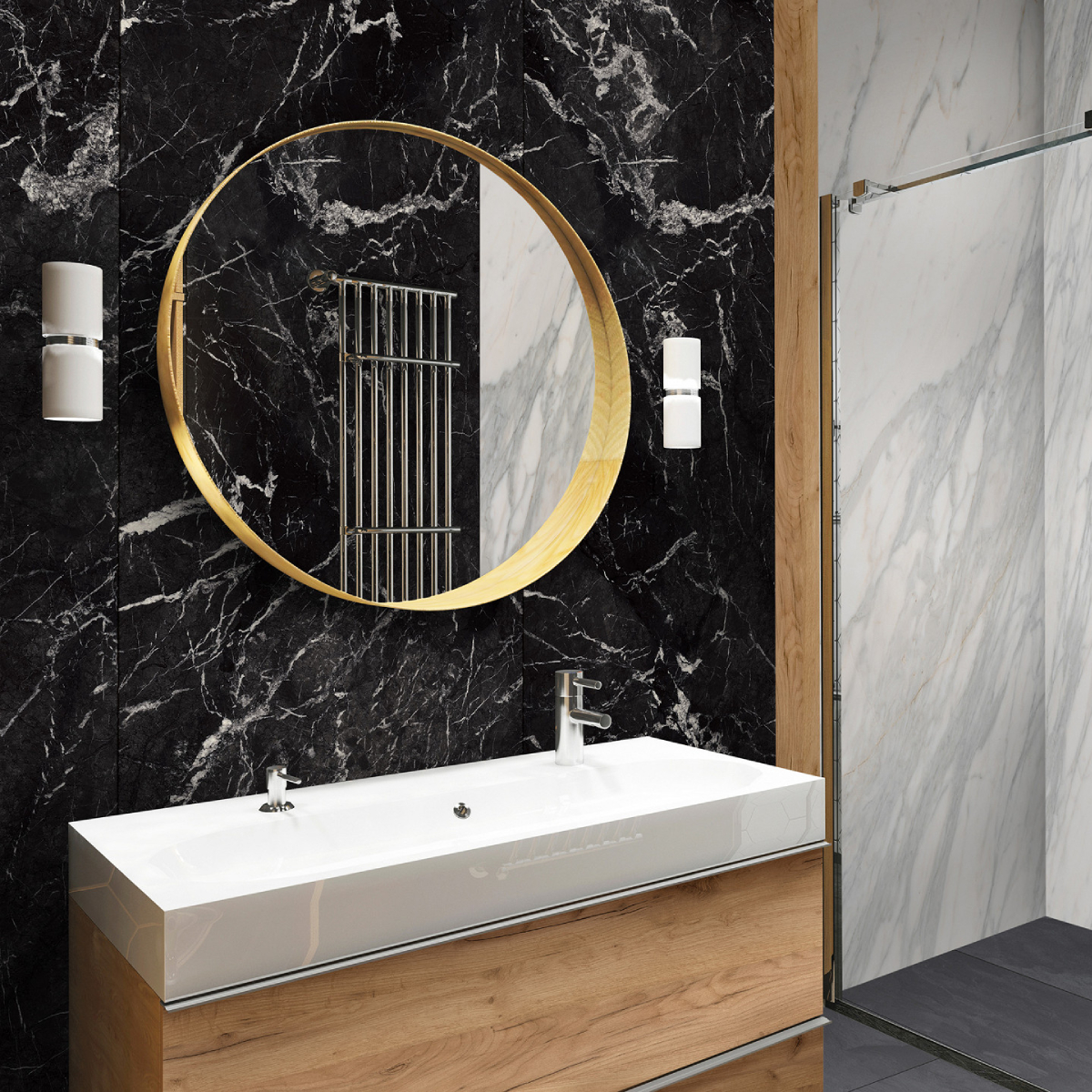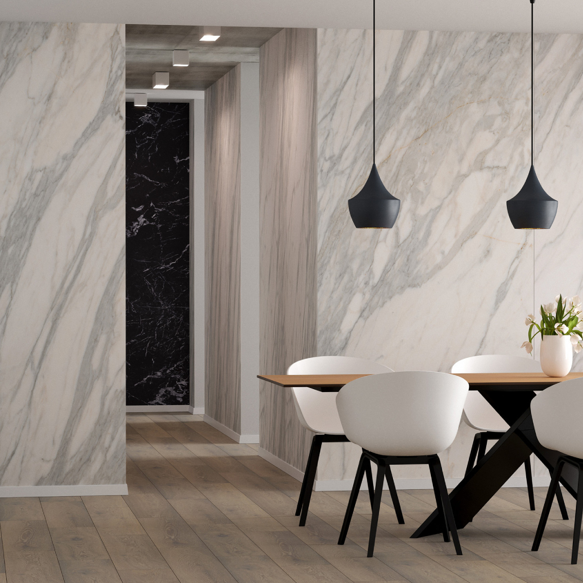 Revestimiento de pared impermeable de la marca Kronospan. La marca Rocko es una gama de paneles de pared SPC impermeables de gran formato que impresionan con su hermoso diseño y excepcionales parámetros de rendimiento. Producidos con tecnología de impresión digital, los paneles de pared con diseños modernos que imitan a la perfección la madera, el hormigón o el mármol se pueden utilizar desde la sala de estar hasta la cocina y el baño. Los productos Rocko se caracterizan por una estabilidad dimensional excepcional , lo que les permite ser instalados en habitaciones muy insoladas y de uso intensivo. A su vez, la resistencia al agua y la alta resistencia a daños y rayones los hacen ideales para la cocina o el baño. Las losas Rocko son un gran producto para una renovación rápida del baño. Además, el patrón de mármol no sucumbirá a las tendencias cambiantes. Los paneles de pared Rocko también se pueden utilizar en el espacio encima de la encimera de la cocina. Los paneles de pared impermeables de gran formato Rocko son una auténtica revolución entre los materiales de acabado y decoración. Los tableros livianos y delgados reemplazarán la pintura, el papel tapiz, el gres y las baldosas cerámicas en la pared. Rocko Tiles son fáciles de instalar, impermeables, higiénicos, funcionales y dimensionalmente estables. Son un material ideal para reformar estancias antiguas , ya que se pueden instalar sobre baldosas antiguas u hormigón. Marquina es un potente mármol negro con una estructura de vetas cristalinas. Combina perfectamente con diseños de piedra en contraste o unicolores negro, gris y blanco para establecer un aspecto lujoso y de alta gama en cualquier espacio. El diseño se divide en tres secciones distintas, cada una con su propia disposición de vetas y variaciones de tono.