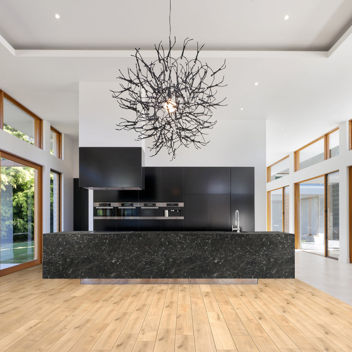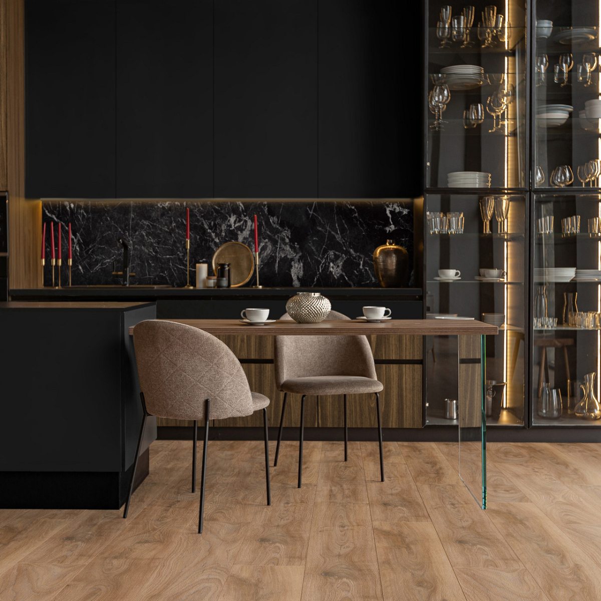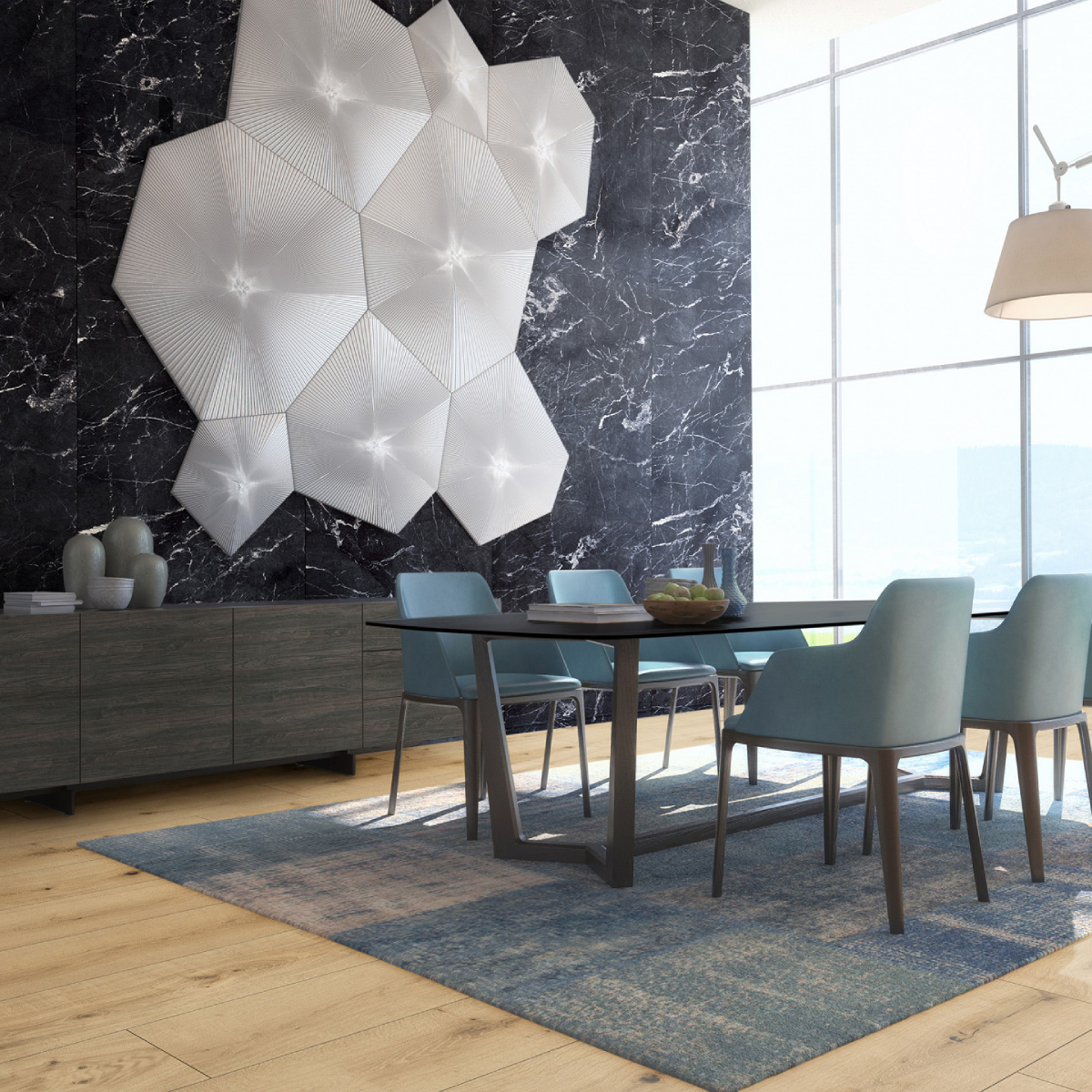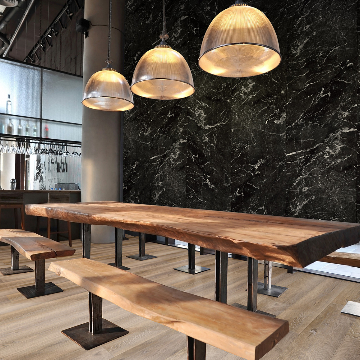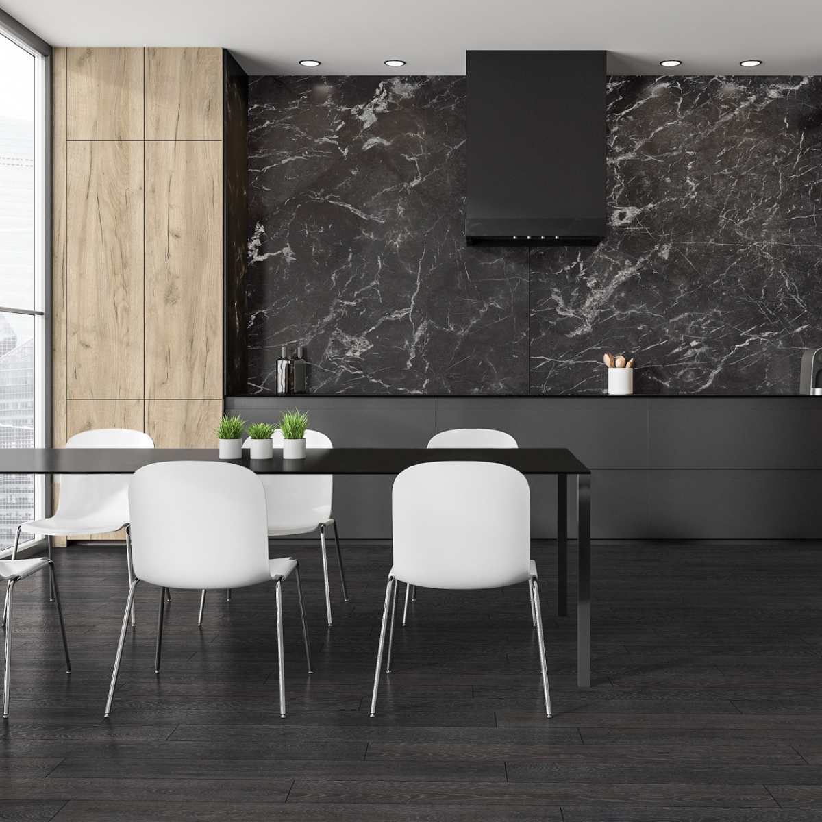 Revestimiento de pared impermeable de la marca Kronospan. La marca Rocko es una gama de paneles de pared SPC impermeables de gran formato que impresionan con su hermoso diseño y excepcionales parámetros de rendimiento. Producidos con tecnología de impresión digital, los paneles de pared con diseños modernos que imitan a la perfección la madera, el hormigón o el mármol se pueden utilizar desde la sala de estar hasta la cocina y el baño. Los productos Rocko se caracterizan por una estabilidad dimensional excepcional , lo que les permite ser instalados en habitaciones muy insoladas y de uso intensivo. A su vez, la resistencia al agua y la alta resistencia a daños y rayones los hacen ideales para la cocina o el baño. Las losas Rocko son un gran producto para una renovación rápida del baño. Además, el patrón de mármol no sucumbirá a las tendencias cambiantes. Los paneles de pared Rocko también se pueden utilizar en el espacio encima de la encimera de la cocina. Los paneles de pared impermeables de gran formato Rocko son una auténtica revolución entre los materiales de acabado y decoración. Los tableros livianos y delgados reemplazarán la pintura, el papel tapiz, el gres y las baldosas cerámicas en la pared. Rocko Tiles son fáciles de instalar, impermeables, higiénicos, funcionales y dimensionalmente estables. Son un material ideal para reformar estancias antiguas , ya que se pueden instalar sobre baldosas antiguas u hormigón. Marquina es un potente mármol negro con una estructura de vetas cristalinas. Combina perfectamente con diseños de piedra en contraste o unicolores negro, gris y blanco para establecer un aspecto lujoso y de alta gama en cualquier espacio. El diseño se divide en tres secciones distintas, cada una con su propia disposición de vetas y variaciones de tono.